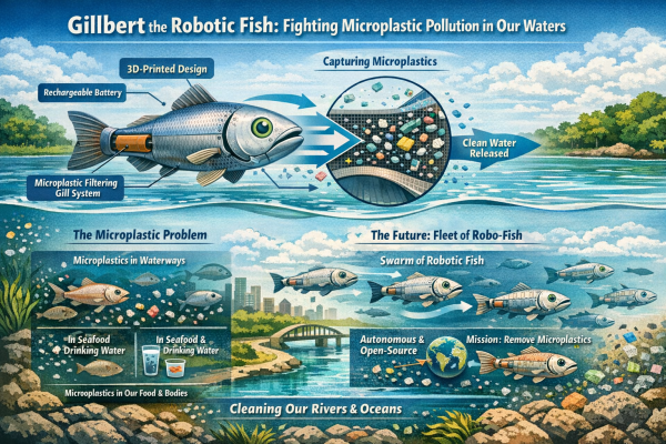 Eleanor Mackintosh, a student at the University of Surrey in the United Kingdom, has developed a robotic fish named Gillbert that moves through water with the smoothness of a real marine creature but with a much more urgent mission. During swimming, Gillbert draws...